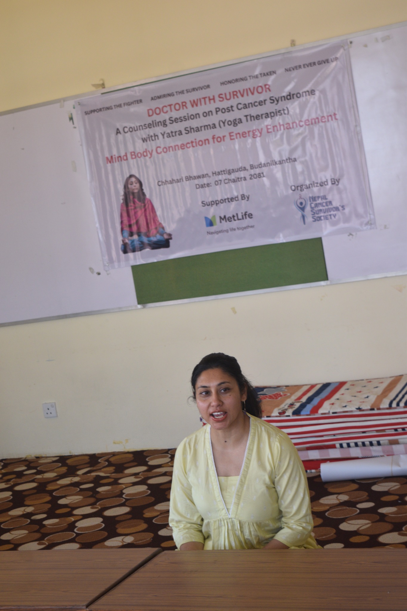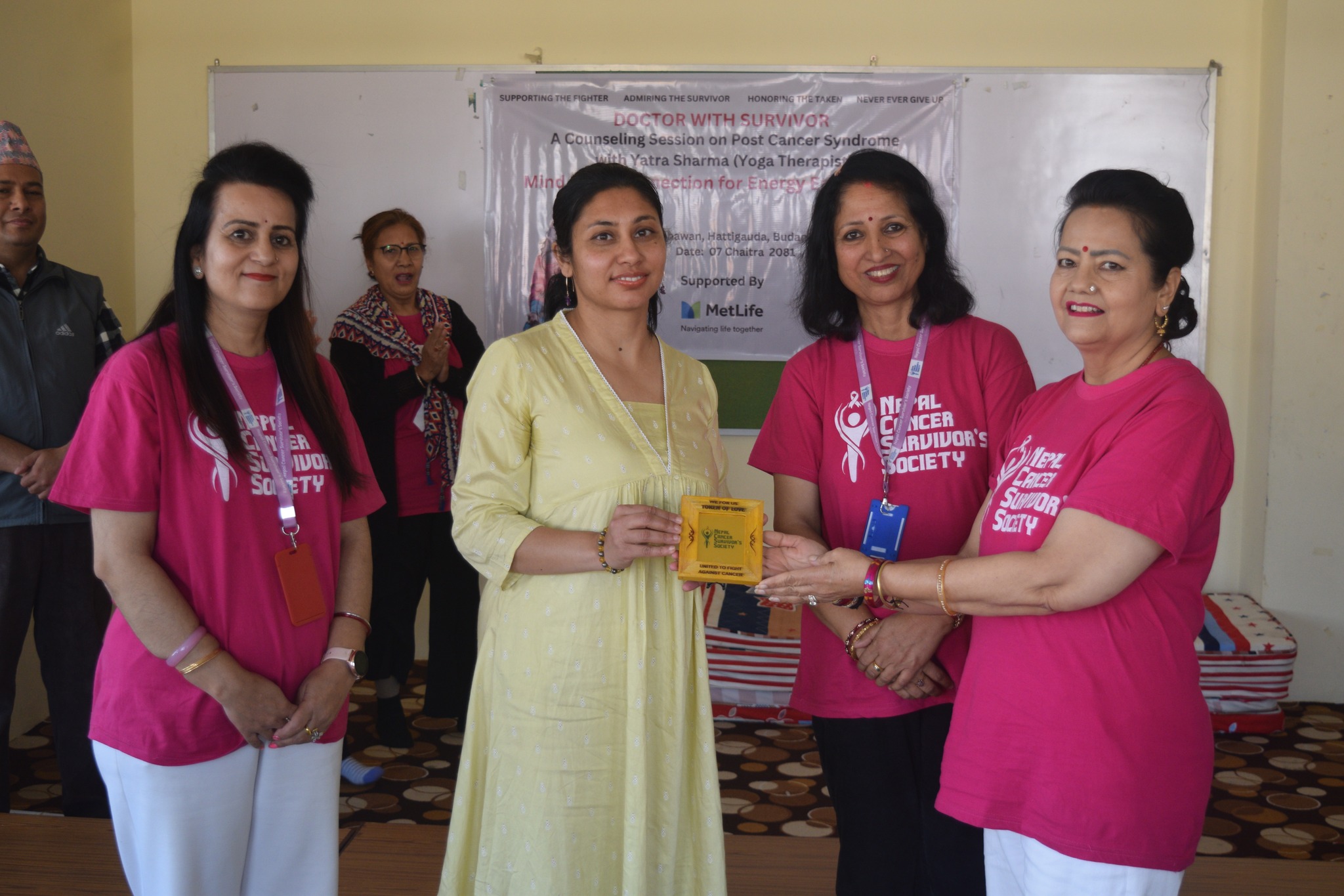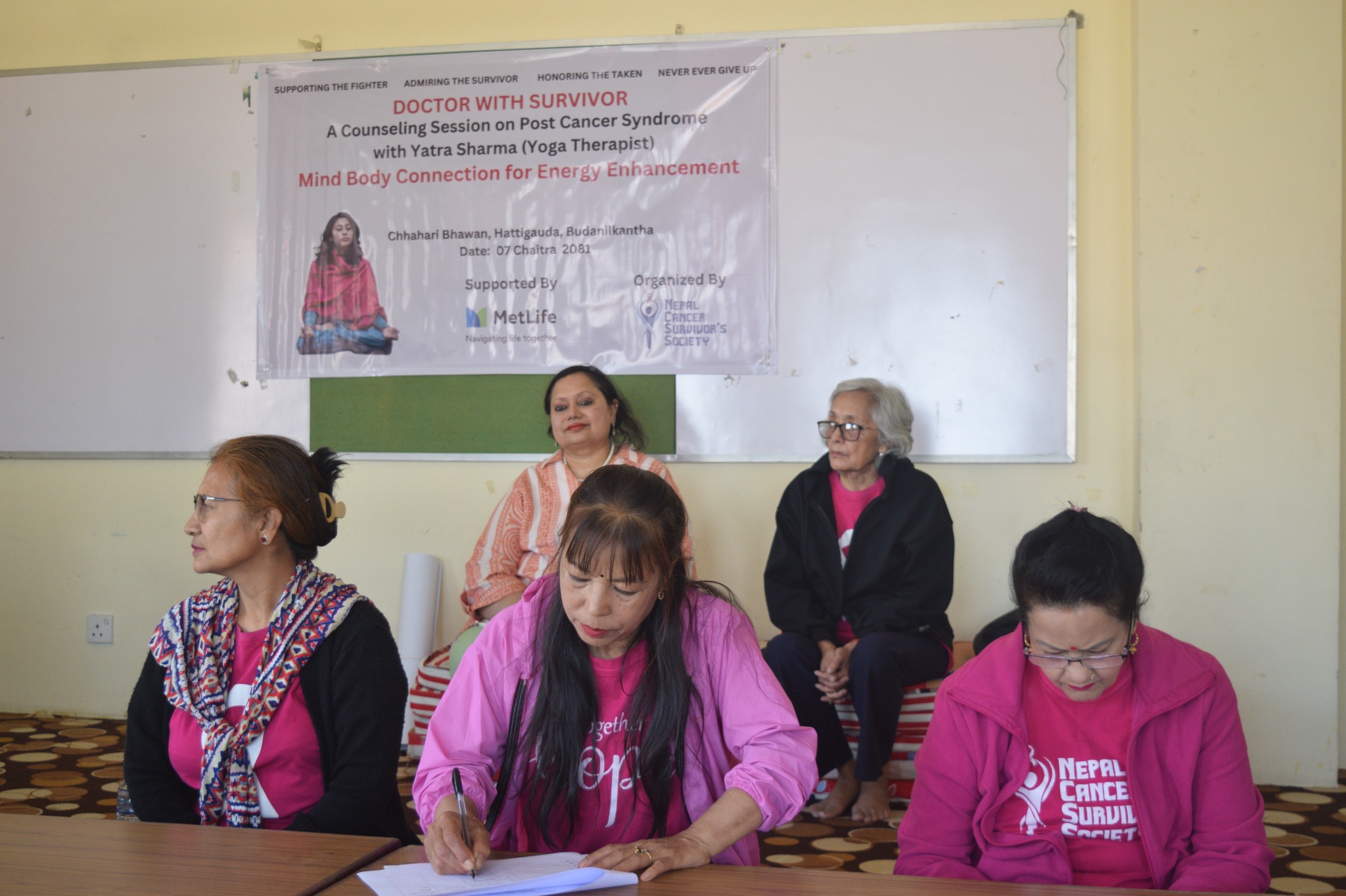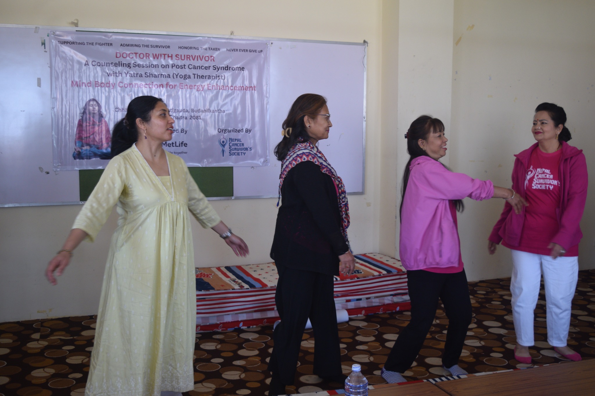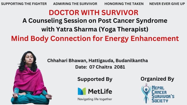 A powerful session titled "Mind-Body Connection for Energy Enhancement" was held today at Chahari Bhawan, bringing together cancer survivors and wellness advocates. The event was facilitated by Ms. Yatra Sharma, a skilled yoga therapist, and supported by MetLife Nepal.